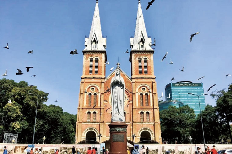 西貢聖母大教堂為1880年法國的建築師以巴黎聖母院為藍圖所建,這座教堂完全是用紅磚所建成,又名紅教堂。教堂前面的花園廣場上有座重達4公噸的聖母瑪利亞雕像,為1945年羅馬教廷所贈。教堂內非常地宏偉壯觀,彩色玻璃窗非常精緻,頗有法國風情。