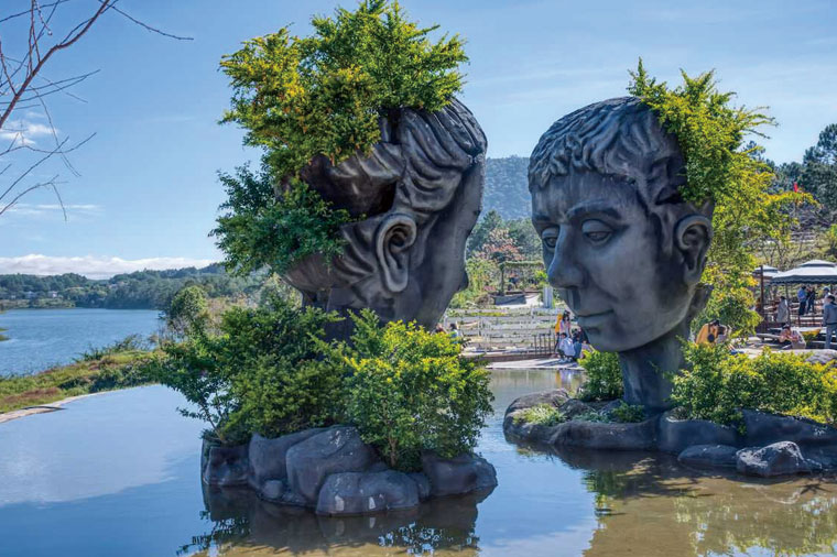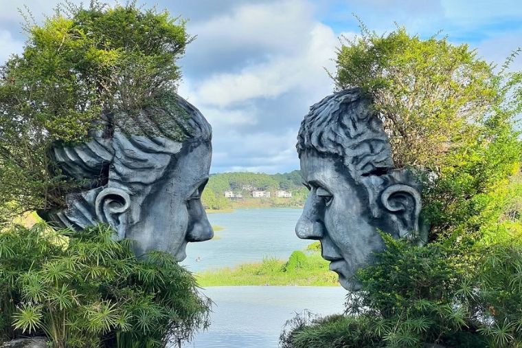 距離大叻市區約30分鐘車程,當地藝術家以在地特有紅土打造一座長達近2公里的巨人國般的「泥雕公園Clay Tunnel」,並以大叻歷史、代表地標、近代創作與最新時事分為4大主題。如最接近入口的第一主題區域,就以大叻被發現的歷史為題,隧道兩側變成高山,猴群攀在牆面好奇地向下望,羊群則站在制高點探頭探腦,旅客彷彿變成當年發現大叻山城的拓荒者般看發展變遷。 第二主題區則利用紅土復刻大叻地標,例如保大皇宮、公雞教堂、大叻車站、大叻遺產酒店等,讓旅客走完一輪,就像玩過一遍大叻般,中間穿插大型書牆或雕像,秒殺手機與相機記憶體。 位於隧道盡頭的第三主題區是最受遊客喜愛的區域,在背山面湖處有一座矗立在山崖邊低頭互望的巨大人頭像,結合泥雕、湖面倒影、綠意,隨著光線變化拍照都有不同氛圍,近年經過社群媒體分享後更一炮而紅,現在更必須要排隊才能拍照。在一旁也有許多結合現在創意與童話發想的泥雕或混合不同媒材的雕塑,讓旅客可以盡情拍照取景。 近年才慢慢發展出來的第四主題區與第一主題區遙遙相望,以花卉、現代飛機、還有影響全球的新冠肺炎為主題設計,最醒目的就是巨大針頭刺向病毒的雕塑,隱含全球一起對抗病毒的過去。