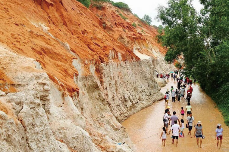 一個非常美麗的名字但不算太長的溪,上游是紅沙丘,所以溪裡的沙泥是紅色的,而白色石灰岩壁,也是所謂的喀斯特地形(尖尖像樹的造型),這也稱溶蝕地形或石灰岩地形,是具有溶蝕性的水對可溶蝕的岩石進行溶解作用,形成的特殊地表型態。它其實是一條流過美奈東側的小溪,隱藏在茂密的樹林中,映襯著藍天白雲,在沙丘和岩層中,風景非常獨特和震撼。仙女溪裡的水很淺,沙子很細很薄,所以一定要脫下鞋子,感受流水和沙子對腳丫的按摩。溪水經過陽光的照射,溪水暖暖的,溫度恰到好處。細細的沙流過腳趾,癢癢的,仿佛有很多纖細的小手在幫你做足浴,很舒服。