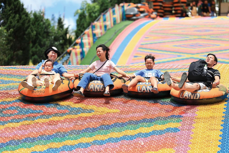 Mongo Land Dalat提供了極致刺激的滑草和乾式充氣滑梯體驗。滑草是一項適合所有年齡的活動,也是入園第一道關卡。滑草區兩側堆疊大草圈防撞,因為坡度設計角度夠,滑草的速度還挺快,有些人因為失控會撞向兩側,是一項刺激有趣的體驗項目。