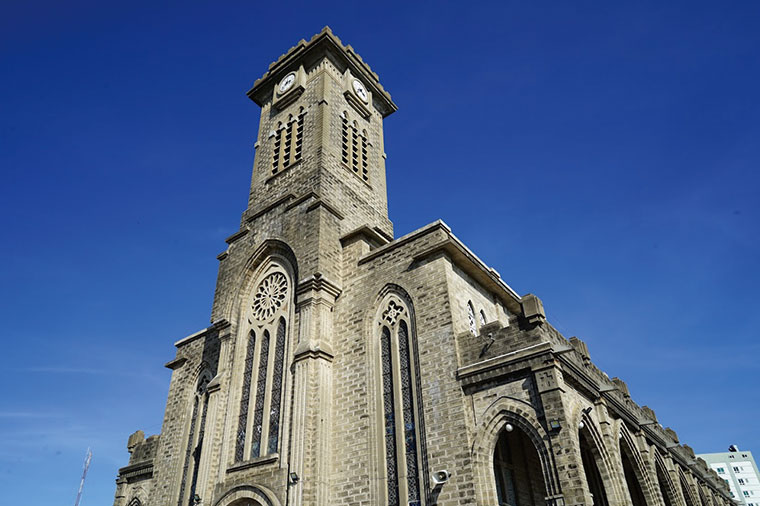又稱基督君王大教堂(Christ the King Cathedral),是芽莊市最具代表性的宗教建築之一,是一座哥特式建築,建于1928-1933年,距今已有將近一百年的歷史,教堂有鐘塔和美如錦花、繪滿《聖經》故事的天窗玻璃,石頭建造的內部牆壁給人清涼之意。教堂外是繁雜吵嚷的街頭, 教堂內則靜謐平和,儼然另一個世界。教堂每天早晚舉行彌撒活動,常能在門外聽見誦經聲或唱詩班美如天籟的歌聲。 芽莊大教堂也是一棟很雄偉的石頭砌成的建築,它是法國哥特式的風格,牆體有雕花圖案,周圍還有很多雕塑和聖經故事的石刻。教堂窗戶是彩色的,陽光照射著異常好看。教堂周圍地勢較高,可以一覽整個芽莊。