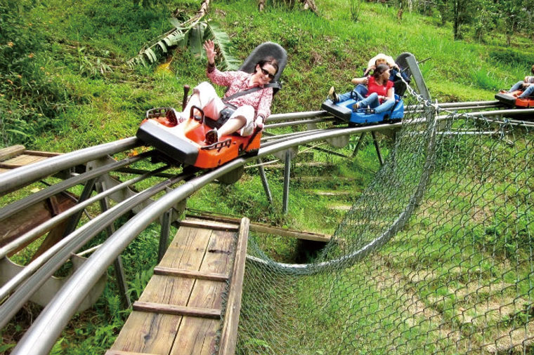 體驗亞洲最長過山車馳騁山林速度感,進入景區等待導遊購買過山車車票,安排大家一人一台斜軌滑車穿過雨林,驚險刺激、峰迴路轉後來到瀑布區,看似需要自行控制的滑車其實是半自動控制,無須擔心駕駛技術,沿著一段陡峭的下坡路可看到位於半山腰的瀑布。一路上雨林風光迷人,到處是各色蝴蝶和各種鳥類的鳴叫。