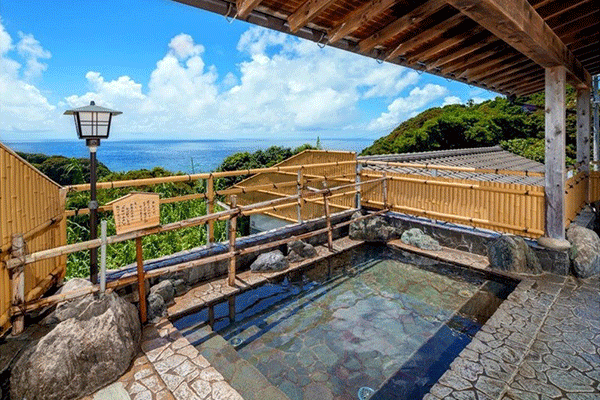 【足摺溫泉】位於四國最南端, 足摺岬的溫泉勝地。岬的突出端聳立有燈檯,可觀望黑潮湧向懸崖峭壁的絕景。溫泉始於約1200年前,相傳弘法大師(774〜835年)在足摺岬建立了金剛福寺,發現浸泡在溪流中湧出熱水中可消除疲勞,這就是最早的溫泉。在大約150年前的大地震後,溫泉停止了噴湧,1999年對泉源進行了挖掘,從而誕生了現在的足摺溫泉。