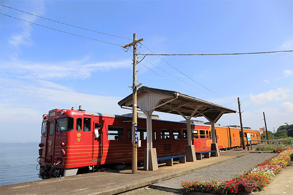 【伊予灘物語鐵道】伊予灘物語列車別出心裁的車身設計,以伊予灘夕陽為連想的漸層暗紅色系,加上活力十足的黃金色基調搭配,同時帶有懷舊與現代感的特殊風情,讓人看了眼睛為之一亮。坐在舒適的車廂中,眺望只屬於愛媛的海岸線,海天一色的景緻,一望無際的伊予灘,沿途居民的熱情歡迎,邊享用著美味的咖啡點心,沉浸在浪漫氛圍中,留下屬於自己的感動鐵道之旅!