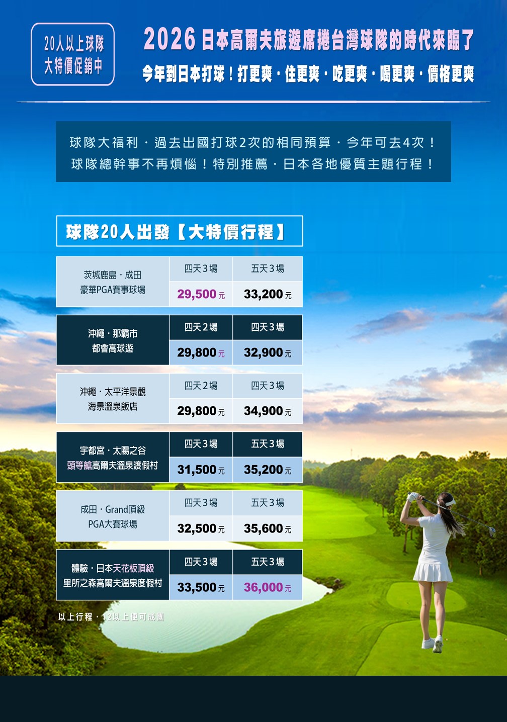 隨著接觸的球場越多,新舊球友的加入,陪同家屬的規劃,新球場的開發,已不是定型式團型能滿足;在統一旅行社的客製化行程規劃下,球友們可擁有高靈活性與自由度,無須與他人湊團,享受優閒的步調。