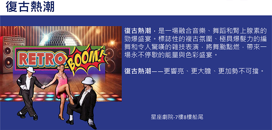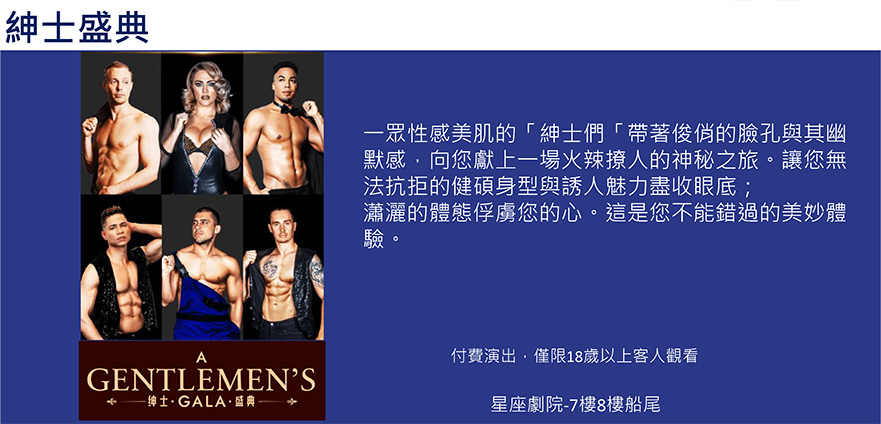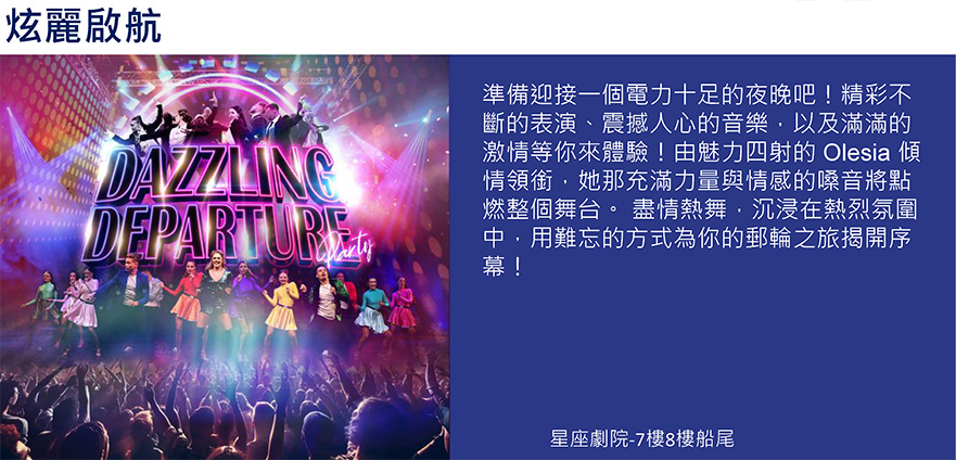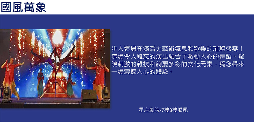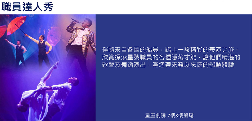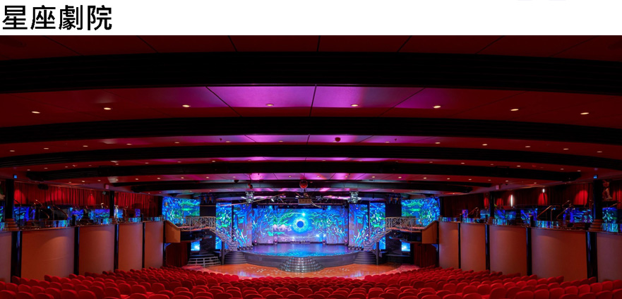 10. 郵輪上星座劇院(7樓船尾)每日在不同時段均有安排精彩的表演,您可以在您的房間取得各項表演項目及時間表,請提早15分鐘前入場以免滿座。